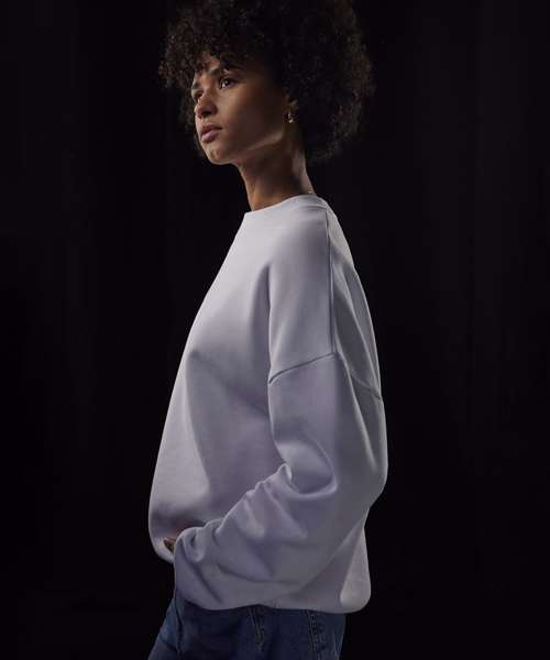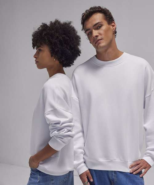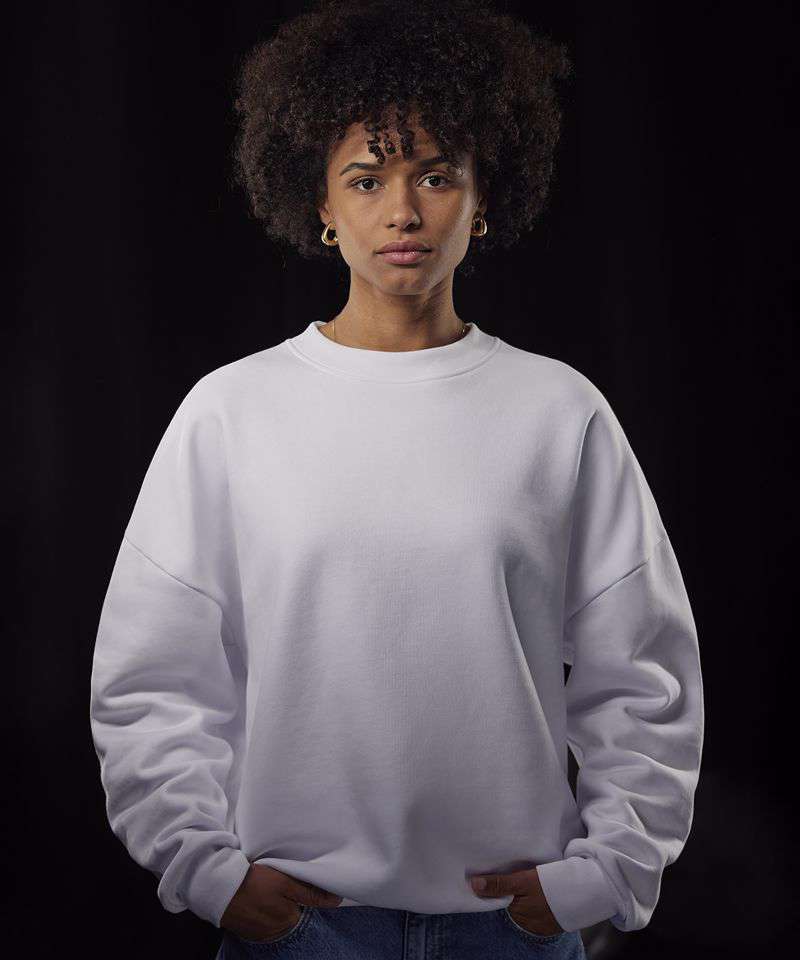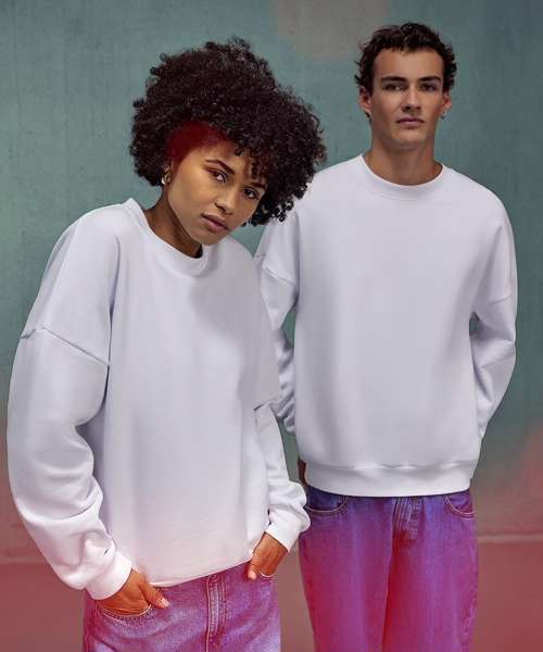 True unisex style with side seams. Durable 350gsm fabric with a sturdy, substantial hand feel. B&C PST (Perfect Sweat Technology). Low shrinkage fleece (LSF). 100% cotton face for perfect printability. Luxurious hand feel. Dropped shoulder and oversized feel for a relaxed fit. High-quality cuffs and bottom hem in 1x1 rib. Curated colour palette to serve POD, influencer and music merch, fashion and retail/e-tail, workwear and academic segments. ‘B&C No Label’ solution for easy rebranding. Contains recycled polyester.