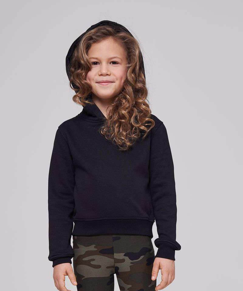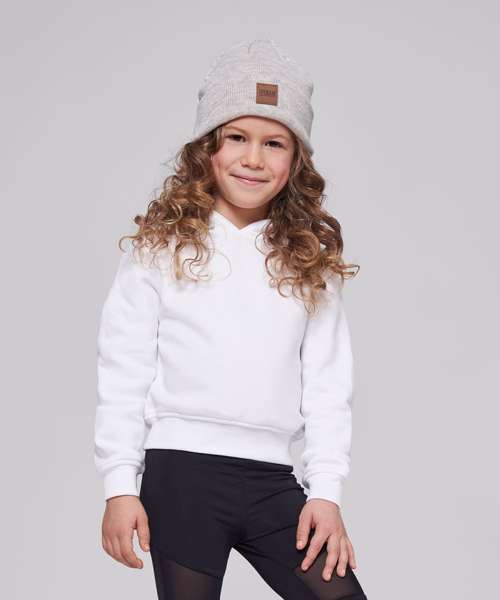 Ideal for cosy hour, the girls cropped sweat hoodie convinces with its balance of typical hoodie details and trendy cropped cut. A hood makes it a comfortable must-have. Wide ribbed cuffs on the sleeves and hem make the perfect look, which can be personalised with prints of your choice. This item is manufactured in a FAMA Certified factory. FAMA stands for Facility and Merchandise Authorisation and is a high standard production certificate.